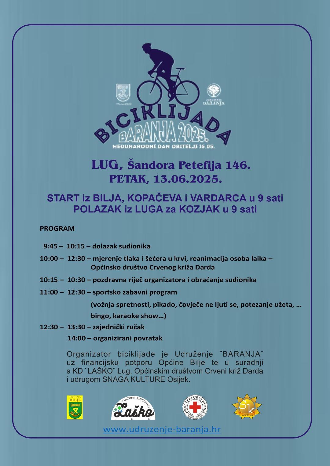 16.06.2025. 13:47 Povodom Međunarodnog dana obitelji 15. svibnja tradicionalno je održana biciklijada „BARANJA 2025“ u organizaciji Udruženja „Baranja“ i partnera. Održavanje biciklijade financijski je pomogla Općina Bilje prema provedenom natječaju odobravanja proračunskih sredstava udrugama za 2025. godinu. Pročitaj više... 19.05.2025. 13:04 Međunarodni dan obitelji obilježen je radnim sastankom projektnog tima sa zaposlenicama davateljima usluga potpore i podrške starijim osobama i osobama s invaliditetom. Sastanci su održani u Domovima kulture u naseljima provedbe projekata uz podjelu prigodnih radno-promidžbenih majica osiguranih u proračunu projekta kao odraz prepoznatljivosti i osigurane vidljivosti u naseljima provedbe projekta. Pročitaj više... 09.05.2025. 12:40 U suradnji s Unikom-om Osijek i Općinom Bilje za sudionike iz projekata programa ZAŽELI održana je edukativna radionica „Svakodnevni izazovi u gospodarenju otpadom“. Radionica je održana u srijedu, 07.05.2025. u Domu kulture u Bilju. Pročitaj više... 24.02.2025. 13:22 Po raspisanom Javnom oglasu, objavljenom 17.02.2025. na Burzi rada HZZ-a te na web stranicama Općine Petlovac, korisnika projekta Udruženja „Baranja“ Lug, partnera provoditelja projekta, koji je trajao do 21.02.2025, kojim se tražila jedna osoba za upražnjeno radno mjesto Radnika/ice za pomoć u kući u projektu „ZAŽELI – Općina Petlovac“ izabrana je kandidatkinja Biljana Đurić, OIB: 87395374721 za radno mjesto Radnik/ca za pomoć u kući u projektu „ZAŽELI – Općina Petlovac“.