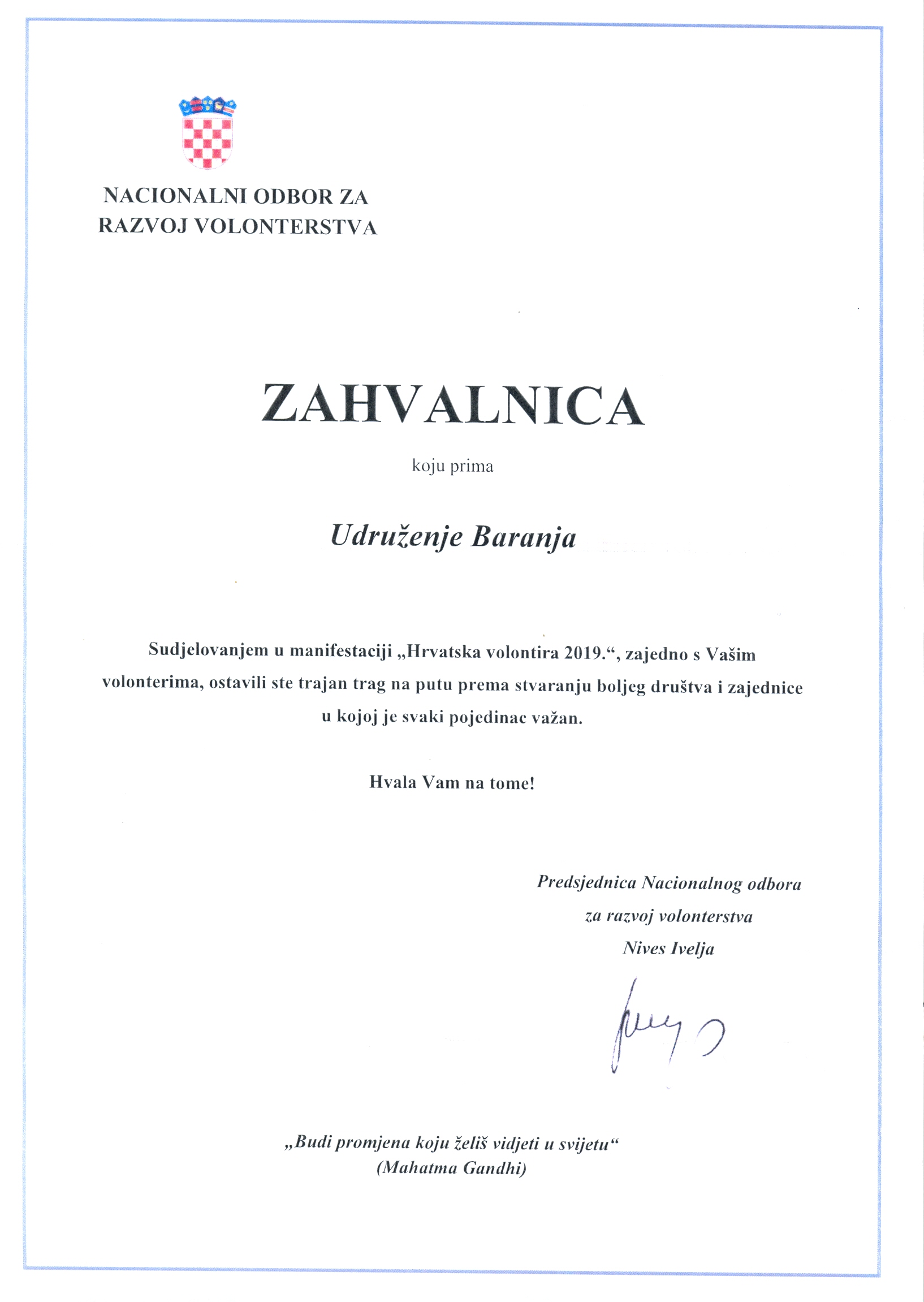 Udruženje "BARANJA" u manifestaciji "Hrvatska volontira 2019"12.07.2019. 12:48 Udruženje "BARANJA" kao organizator volontiranja primilo je izvještaj o provedenoj manifestaciji i zahvalnicu Hrvatskog centra za razvoj volonterstva.