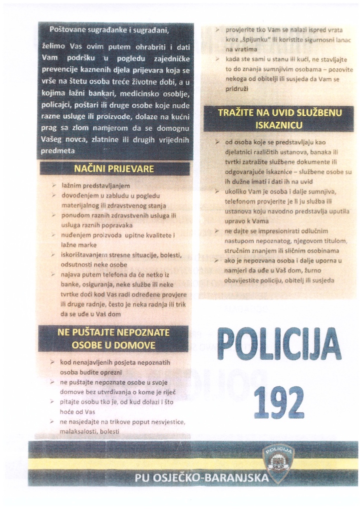 Kroz razgovor korisnicima je ukazano na neke načine prijevara i trikova kojima se prevaranti služe te su im dani savjeti kako reagirati u slučaju uočavanja sumnjivih osoba ili radnji. Također su podijeljeni letci sa informacijama i istaknutim brojem telefona PU Osječko Baranjske na koji se može prijaviti eventualno kazneno dijelo.