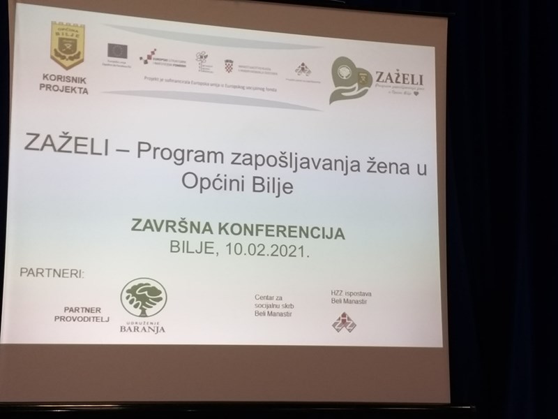 Održana Završna konferencija projekta „ZAŽELI – Program zapošljavanja žena u općini Bilje“ iz programa „ ZAŽELI“12.02.2021. 14:05 Završna konferencija projekta „Zaželi – Program zapošljavanja žena u općini Bilje“ kodni broj UP.02.1.1.05 održana je u srijedu, 10.02.2020. u Domu kulture u Bilju. Projekt je ukupne vrijednosti 3.858.927,00 kn i u cijelosti je financiran sredstvima Europskog socijalnog fonda a provodi se u periodu od 29.08.2018. do 28.02.2021.godine.