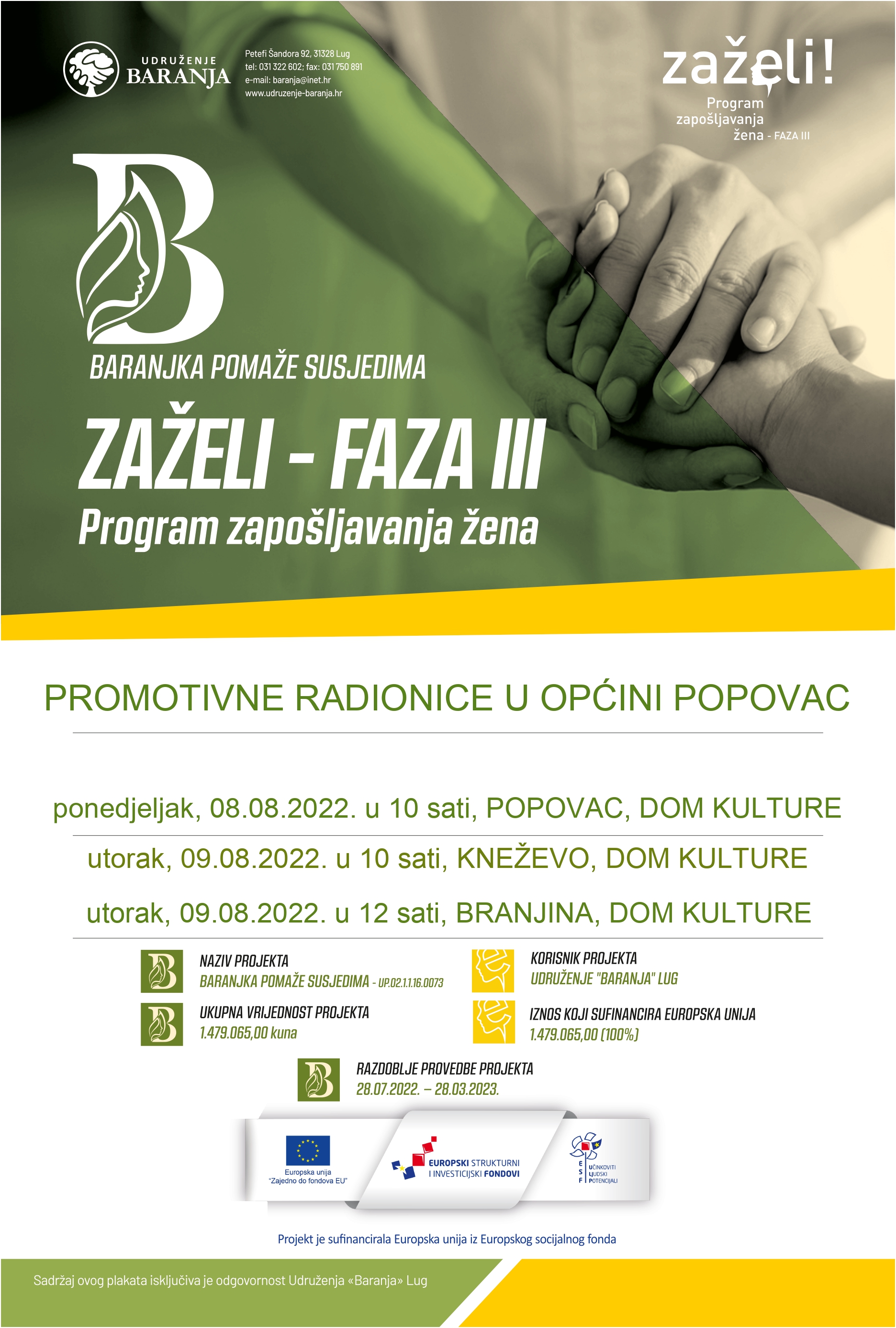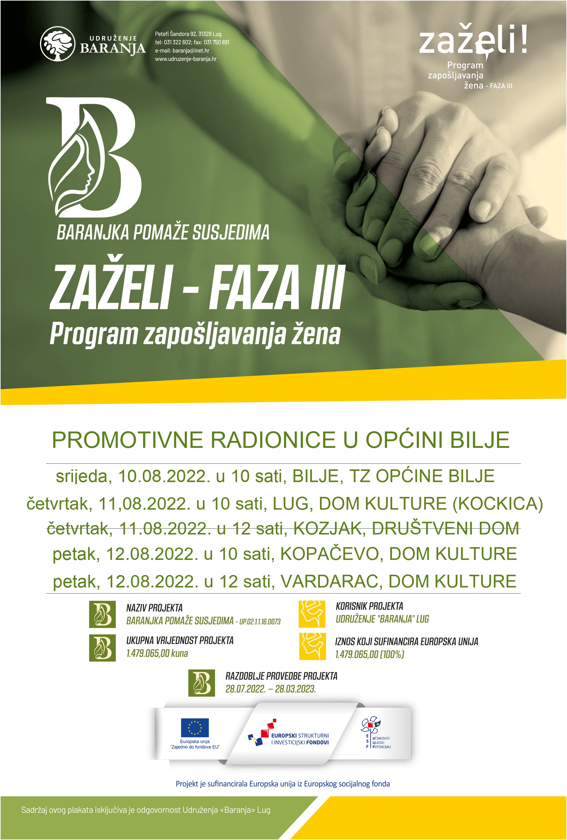 Na promotivnim radionicama po naseljima općina provedbe projekta zainteresirani će biti upoznati o pojedinostima projekta s naglaskom na uvjete za zapošljavanje nezaposlenih žena za rad na ovom projektu te o uvjetima i načinu ostvarivanja statusa krajnjeg korisnika, primatelja usluge pomoći u kući.
