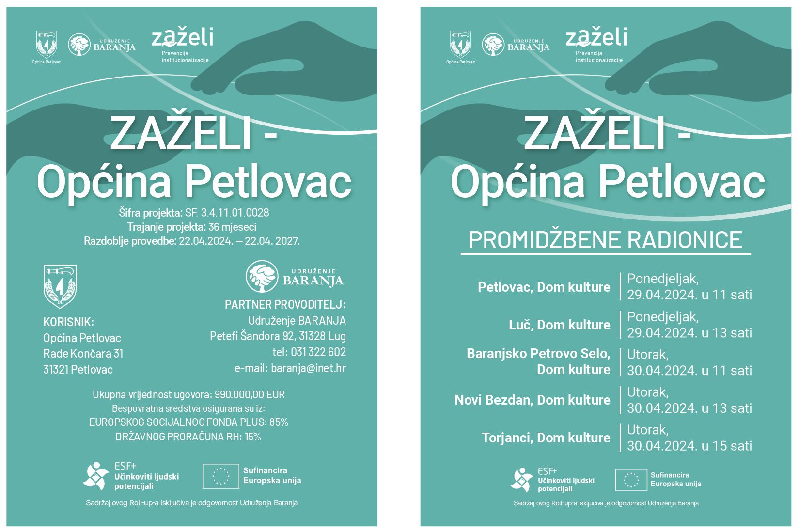 Promidžbenim radionicama u naseljima provedbe bit će predstavljen odobreni EU projekt. Radionice su namijenjene svim zainteresiranima a posebno potencijalnim primateljima usluge potpore i podrške kao i potencijalnim zaposlenicima – pružateljima usluge potpore i podrške. Bit će predstavljeni uvjeti, rokovi i dokumentacija za što jednostavnije prijavljivanje na Javni poziv i uključivanje u projekt.