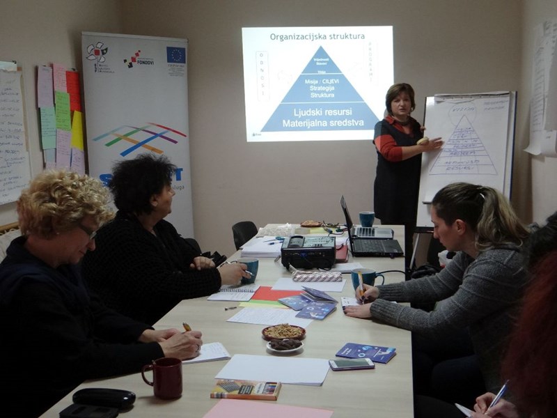 Projekt SOS-NET: Održana dvodnevna radionica „Strateško planiranje“18.12.2015. 15:04 U okviru projekta SOS-NET koji je započeo u prosincu 2014. Godine organizirana je dvodnevna radionica „Strateško planiranje“. Svrha radionice jejačanje kapaciteta OCD za vlastiti razvoj i stabilnost , a koje se bave pružanjem socijalnih usluga te podizanje kvalitete socijalnih usluga koje OCD pružaju korisnicima Radionica je održana na dvije lokacije: Osijek (8. i 9. prosinca 2015.) i Orahovica (16. i 17. prosinca 2015.). Na radionicama je sudjelovalo 30-ak sudionika iz OCD s područja pet slavonskih županija. Radionicu je vodila Sonja Vuković iz Udruge za kreativni razvoj SLAP iz Osijeka, trenerica s bogatim dugogodišnjim iskustvom u području strateškog planiranja.